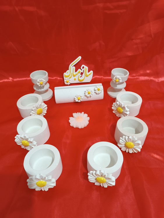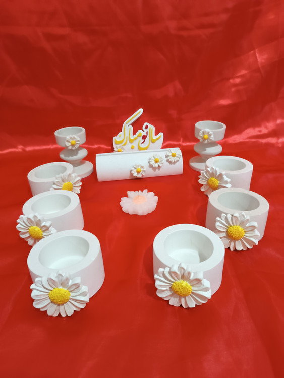 هفت سین ۹تکه سنگ مصنوعی با تزیین گل بابونه ،شامل ۶عددظرف،۲عدد جاشمعی و یک عدد استند آینه میباشد